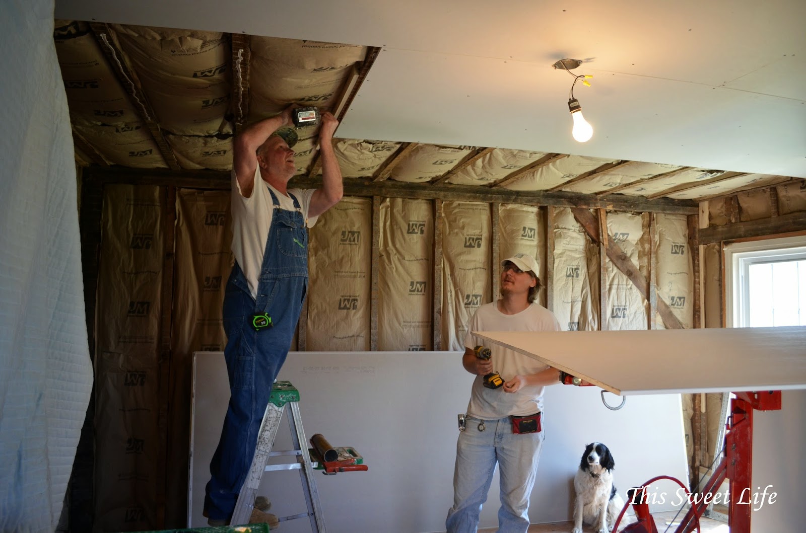 In Grandmommy's room, across the hall, insulation is complete, and Mark and Cody are hanging drywall now.
